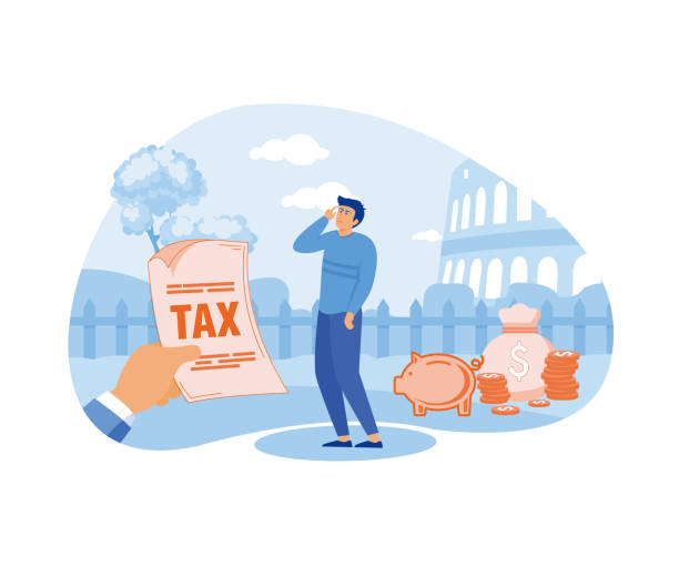 Entrepreneur holding saving piggybank looking at tax bills. Tax burden or debt to pay for income tax, financial charge and duty to pay for government. flat vector modern illustration